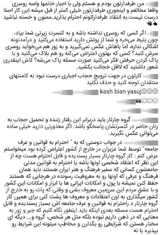 «کار گروه چارتار بسیار پسندیده و قابل احترام هست چه از این نظر که اعتقاد شخصی اونها باشه یا احترام به قوانین مدنی جامعشون کسانی که سفیر فرهنگ و هنر ایران هستند باید همان فرهنگ و عرفی که اونها رو به معروفیت رسونده در هرجایی که هستند حفظ کنن نمیشه با پول و امکانات ایرانی ها با ابزار و امکانات این کشور و با عشق مردم این سرزمین معروف بشی و وقتی که پات رو به خارج از کشور میگذاری به اون اعتقادات و معروف ها پشت کنی»
