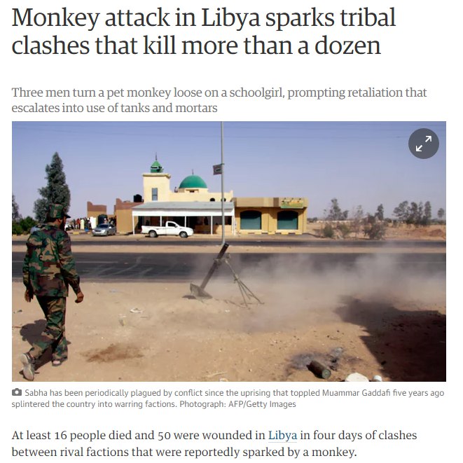 بعد از اینکه یک #میمون خانگی روسری یه دختر مدرسهای را از سرش کشیده بین دو #قبیله با تانک و خمپاره جنگ شروع شده و ۱۶کشته و ۵۰نفر زخمی شدند. t.co/3LoF5FbKmt