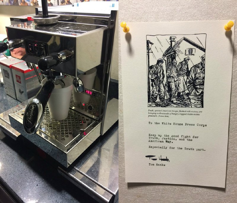 #تام_هنکس که دو بار جایزه اسکار گرفته برای خبرنگارهای کاخ سفید #قهوهساز فرستاده و براشون نوشته که تلاش در راه #حقیقت و #عدالت را ادامه بدید.