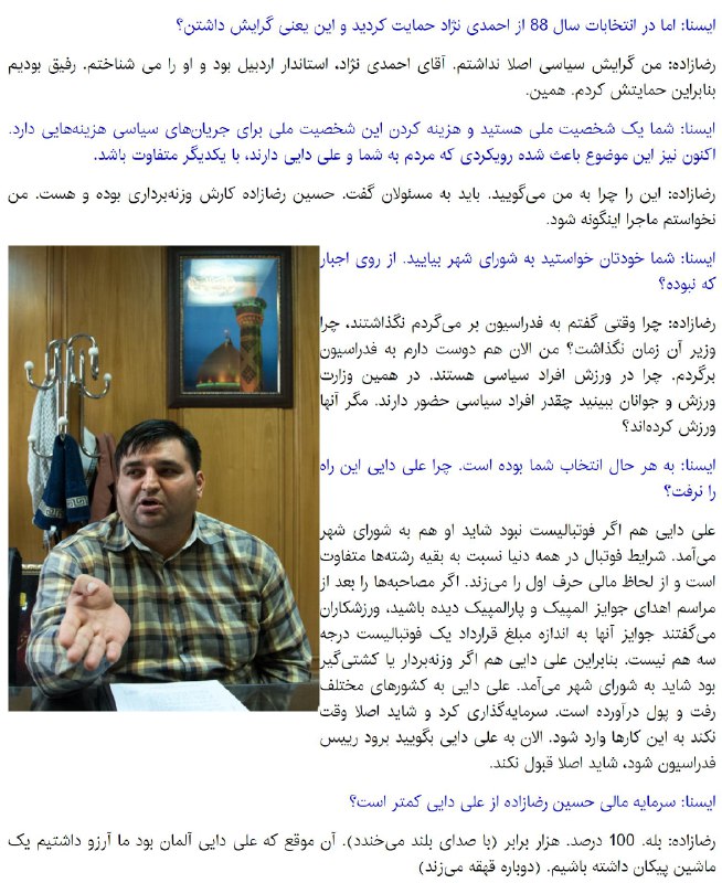 ایسنا؛رضازاده: دایی اگر وزنهبردار یا کشتیگیر بود شاید به شورای شهر میآمد.او کشورهای مختلف رفت و پول درآورده و شاید وقت این کارها را ندارد