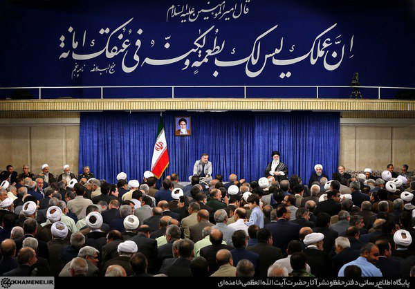 در سخنرانی جنجالی آیتالله #خامنهای که دوران #بنیصدر رو یادآوری کرد و خیلیها اون رو شدیدترین انتقاداتش از دولت #روحانی برداشت کردند، جملهای بالای سرش دیده میشد. (تصویر پایین)