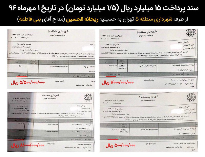 برای مثال شهرداری منطقه ۵ در مهرماه امسال ۱/۵میلیارد تومان به حسینیه #ریحانه_الحسین (مداح آقای بنیفاطمه) پرداخت کرده است.