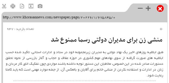 طی ابلاغیه ای که اخیرا تحت موضوع "عفاف و #حجاب" به ادارات دولتی ارسال شده، استفاده از منشی #زن برای مدیران مرد و بالعکس ممنوع شده است.