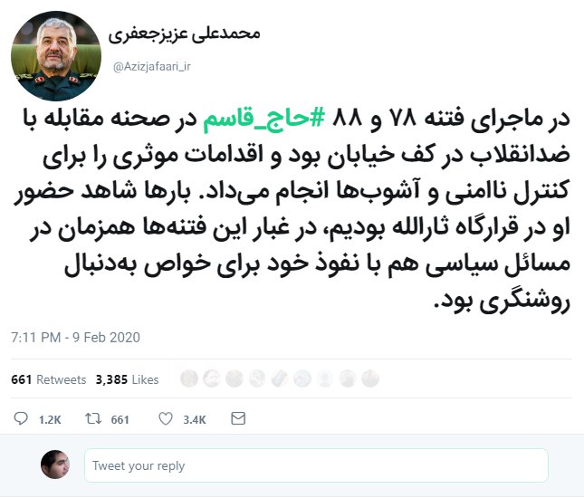 ... انتشار توئیت[ی با نام] فرمانده سابق سپاه پاسداران درباره نقش قاسم سلیمانی در سرکوب اعتراضهای داخلی با واکنشهای متعددی روبهرو شد [تصویر پایین پست]: Azizjafaari_ir