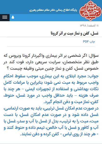به عنوان نمونه، آیت الله یوسف صانعی گفته اگر امکان سرایت بیماری وجود داشته باشد، میتوان از مراسم مذهبی شستشوی جسد با آب یا "غسل میت" خودداری کرد.