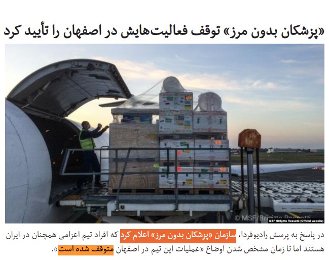 [دیروز بعضی منابع فارسیزبان از جمله همین رادیوفردا از روی توییت منتفی شدن برپایی بیمارستان، پیش پیش خبر از اخراج پزشکان بدون مرز داده بودند که رادیوفردا تیتر اون مطلبش رو بعدا عوض کرد به اینکه وزارت بهداشت حضورشون در پروژه اصفهان رو منتفی خواند.]