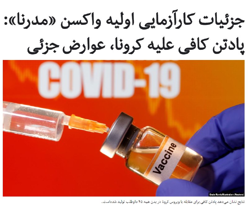 دو ماه پس از بیانیه امیدوارکننده شرکت آمریکایی «مدرنا» در مورد #واکسن آزمایشی آن برای مقابله با ویروس #کرونا، حال جزئیات کارآزمایی بالینی روی ۴۵ تن از داوطلبان منتشر شده که واکنش مثبت و استقبال بخشی از جامعه علمی را همراه آوردهاست.