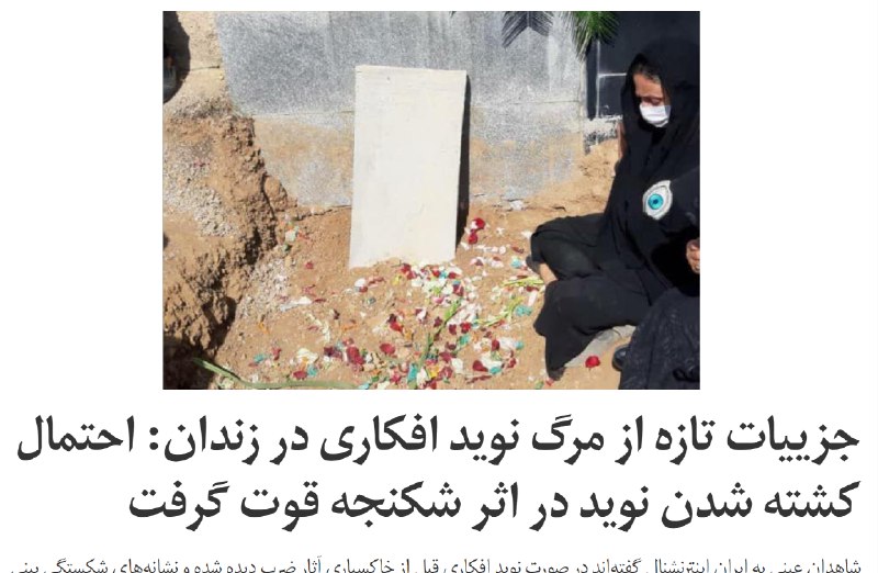 یک شاهد عینی نزدیک به خانواده #نوید_افکاری به بیبیسی فارسی گفته که هنگام تحویل جنازه، به نزدیکان او فقط اجازه دادند صورتش را ببینند. به گفته این شاهد "بینی آقای افکاری شکسته بوده است."