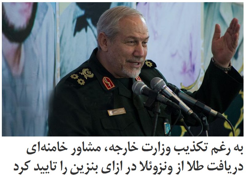 یحیی #رحیم_صفوی، دستیار ارشد رهبر جمهوری اسلامی در امور نظامی، روز یکشنبه ششم مهر گفت: «ما به ونزوئلا بنزین دادیم و شمش طلا گرفتیم و طلاها را هم با هواپیما به ایران آوردیم تا در راه اتفاقی برایش نیفتد.»