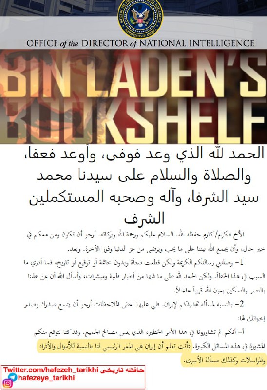 "نامه اسامه #بن_لادن به برادر کریم [ابوایوب المصری رهبر #القاعده در عراق]، ۱۸ اکتبر۲۰۰۷: «#ایران شاهرگ اصلی تامین منابع مالی، نفرات و ارتباطات ما است» (سند به دست آمده از مخفیگاه بن لادن در ابیتآباد پاکستان، منتشره در مارس ۲۰۱۶ توسط دفترکل اطلاعات ملی آمریکا)" hafezeh_tarikhi