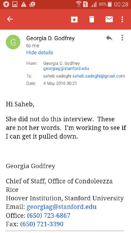 "مکاتبه من با خانم جورجیا گادفری رئیس دفتر کاندولیزا رایس: رایس مصاحبه ای با مجله عصر اندیشه نداشت! t.co/B7BLop4jpP"