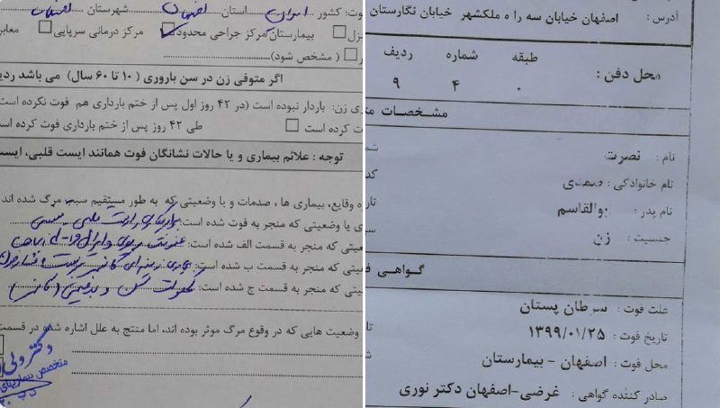 چنان که از گواهی فوت پزشک، مشخص است، بیماری مادرم کرونا بوده است و به سرطان سینه و فشار خون به عنوان بیماری زمینهای اشاره شده است.