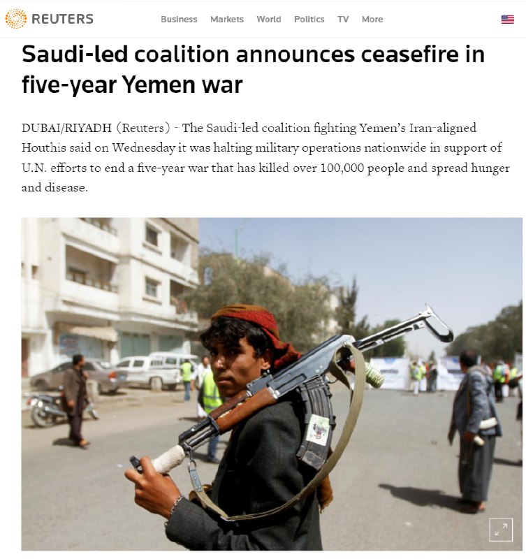 #ائتلاف_عربستان که از دولت رسمی یمن حمایت می کند در بیانیه ای نوشت: "برای حفظ و کمک به موفقیت تلاشهای فرستاده سازمان ملل در امور یمن و تخفیف رنج مردم دوست و برادر یمن و تلاش برای مقابله با اپیدمی جهانی #کرونا و جلوگیری از شیوع آن، ائتلاف یک آتش بس جامع را برای یک دوره دو هفته ای اعلام می کند که از روز پنجشنبه شروع می شود."