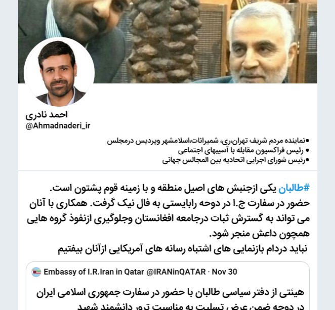 جناب #احمد_نادری هستند، نماینده تهران و "رئیس شورای اجرایی اتحادیه بین المجالس جهانی". در وصف برادرانشان در "جنبش اصیل" طالبان نوشته اند. عزیزان یک کم دیگر دل به کار بدهند، انشاءالله مختصر رودربایستی باقی مانده با "جنبش اصیل" القاعده هم برطرف میشود.