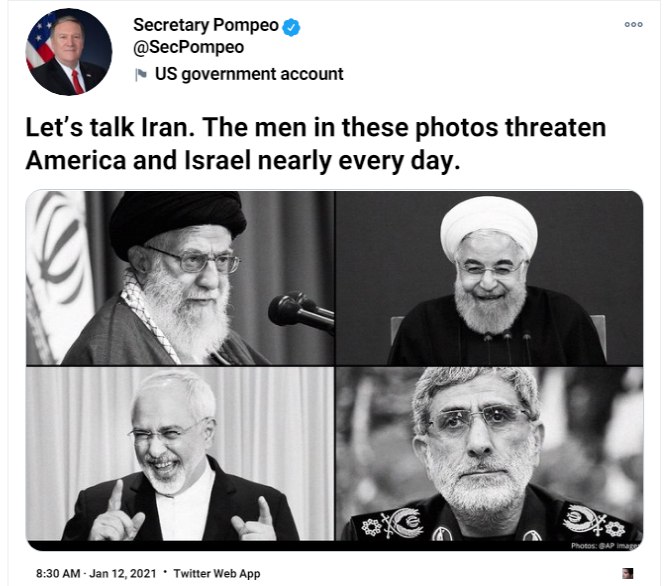 مایک پمپئو همچنین با انتشار عکسی از #خامنهای، #روحانی، #قآانی و #ظریف نوشت: «این افراد تقریبا هر روز آمریکا و اسرائیل را تهدید میکنند.»