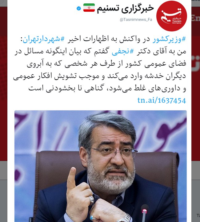 #نجفی یک ادعایی کرده.اما #قالیباف تا این لحظه سکوت کرده و واکنشی نشون نداده.اینکه چرا [وزیر] کشور در جایگاه #کدخدا توصیه میکنند نجفی دهنش را ببندد بجای اینکه بخواهند دفاعیات قالیباف را بشنوند خود میتواند به منشا تشویش اذهان عمومی تعبیر شود.