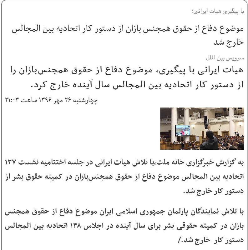 هیات ایرانی با پیگیری، موضوع دفاع از حقوق همجنسگرایان را از دستور کار اتحادیه بینالمجالس سال آینده خارج کرد./خانه ملت