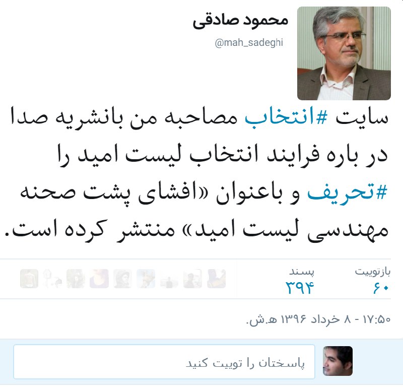 سایت [انتخاب] بعد از انتخابات رسماً داره جعل خبر می‌کنه برای اهدافش. اون از #عارف این از #محمودصادقی.