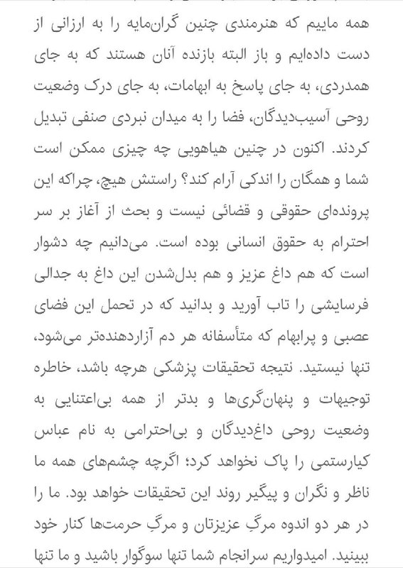 "#کیارستمی چهرهی جهانی بود این بلا تو بیمارستان سرش اومد، مرد عادی چه بلاهایی سرشون میآد و دستشونم به هیج جا بند نیست.