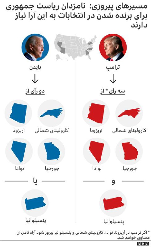 محاسبات زیر از نگاه بیبیسی و سیانانه که هنوز درباره آریزونا مطمئن نیستند. رسانههایی دیگر از جمله اسوشیتدپرس و فاکسنیوز تکلیف آریزونا رو هم مشخص میدونند و آرای الکترالش رو به حساب بایدن گذاشتند. از نظر اونها نتیجه فعلی ۲۶۴ به ۲۱۴ است و بایدن هر کدوم از ایالتهای باقی مونده رو ببره به باقی نیازی نداره. #Election2020