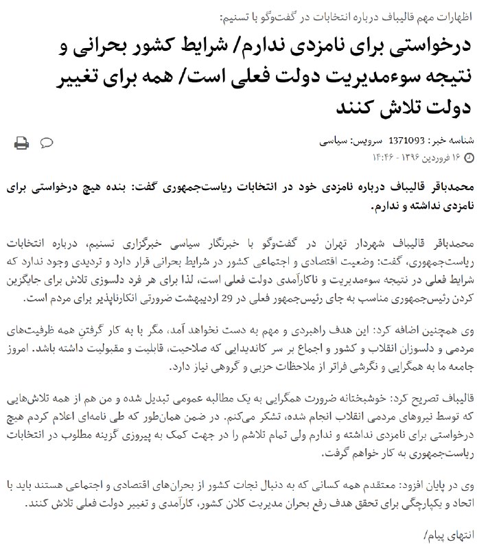 #قالیباف که بازم نگفت نمیام، گفته «هیچ درخواستی برای نامزدی #انتخابات نداشته و ندارم» یعنی اگه درخواست باشه، میاد!