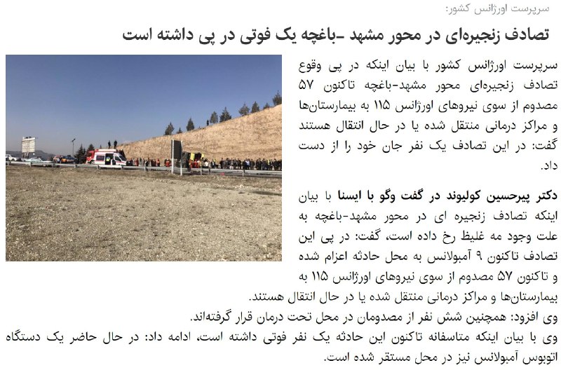 #تصادف_زنجیرهای در محور مشهد -باغچه یک فوتی در پی داشته است.