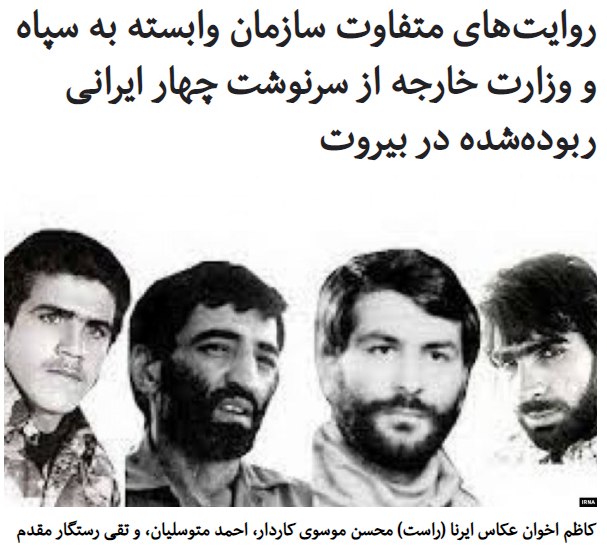 بر اساس روایت مقامها و رسانههای دولتی ایران، #احمد_متوسلیان وابسته نظامی سفارت ایران در بیروت، #محسن_موسوی کاردار، #تقی_رستگار_مقدم کارمند و #کاظم_اخوان عکاس خبرگزاری جمهوری اسلامی، چهاردهم تیر سال ۱۳۶۱ در پست بازرسی فالانژیستهای مسیحی در شمال بیروت ربوده شدند و از آن تاریخ هیچ اطلاعی از سرنوشت آنها در دست نیست.