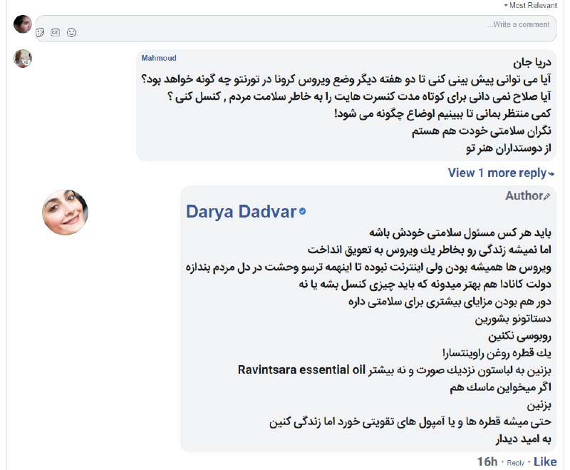 یک ترسی منو فرا گرفته تو این چند روز ۴ تا مسافر از ایران برگشته بودن که کرونا وارد تورنتو کردن. الان کنسرت داریوشه، چند روز دیگه جشنواره نوروزی تیرگان و یکی دیگه به اسم کاغذ رنگی تورنتو که کلی از ایران برگشته حضور دارن و ترسم اینه تورنتو رو به فاک فنا بدیم نتونیم سر بلند کنیم.