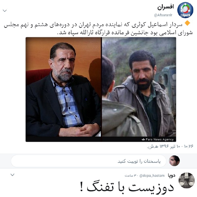 "سردار اسماعیل کوثری جانشین فرمانده قرارگاه ثارالله سپاه شد. اگر نظامی بود چرا تو سیاست بود اگر تو سیاست بود چرا نظامی بود؟ روح امام شاد"