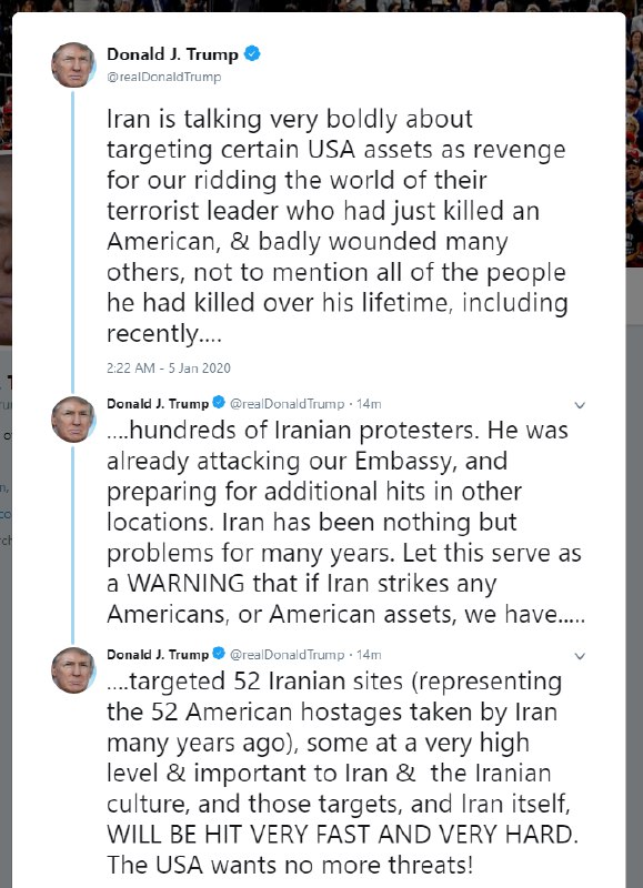 "ما ۵۲ سایت ایران (معادل ۵۲ گروگان آمریکایی که ایران خیلی سال پیش گرفت) و برخی دارای ارزش و اهمیت بالا برای ایران و فرهنگ ایرانی هستند را در تیر رس داریم، و به این اهداف و خود ایران، به سرعت و به شدت حمله خواهد شد. آمریکا دیگر هیچ تهدیدی را تحمل نمیکند!"