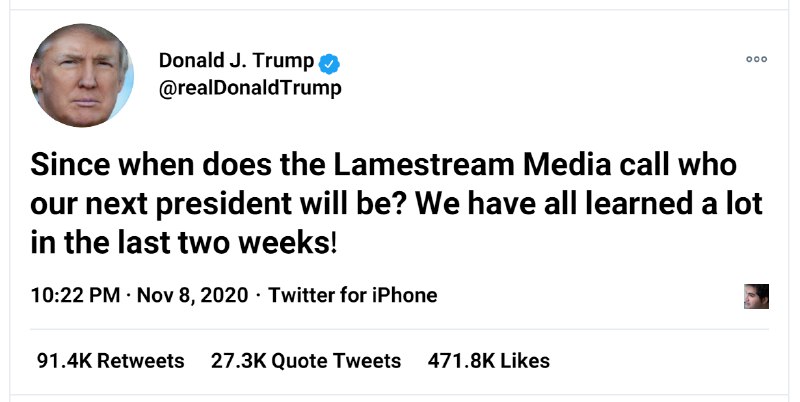 دونالد ترامپ، رییسجمهور آمریکا، در توییتی درباره انتخابات نوشت: از چه زمانی تا حالا، رسانههای خالی از معنی اعلام میکنند رییسجمهور بعدی چه کسی خواهد بود؟ همه ما در دو هفته اخیر خیلی چیزها آموختهایم