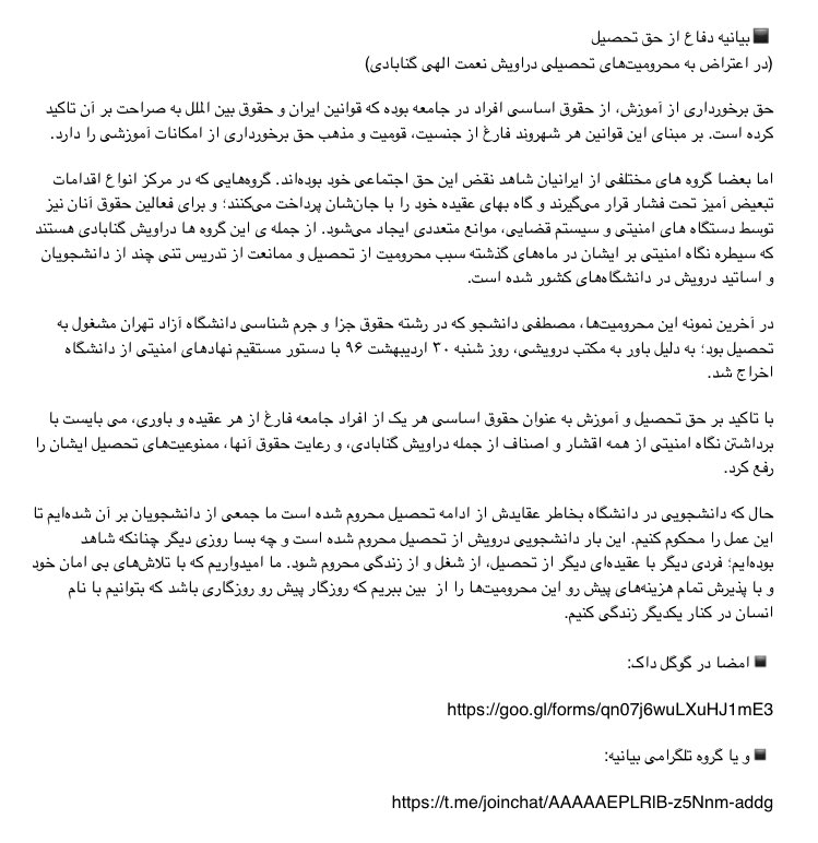 بیانیه دفاع از #حق_تحصیل در اعتراض به محرومیهای تحصیلی دراویش گنابادی در حال امضا توسط دانشجویان است.