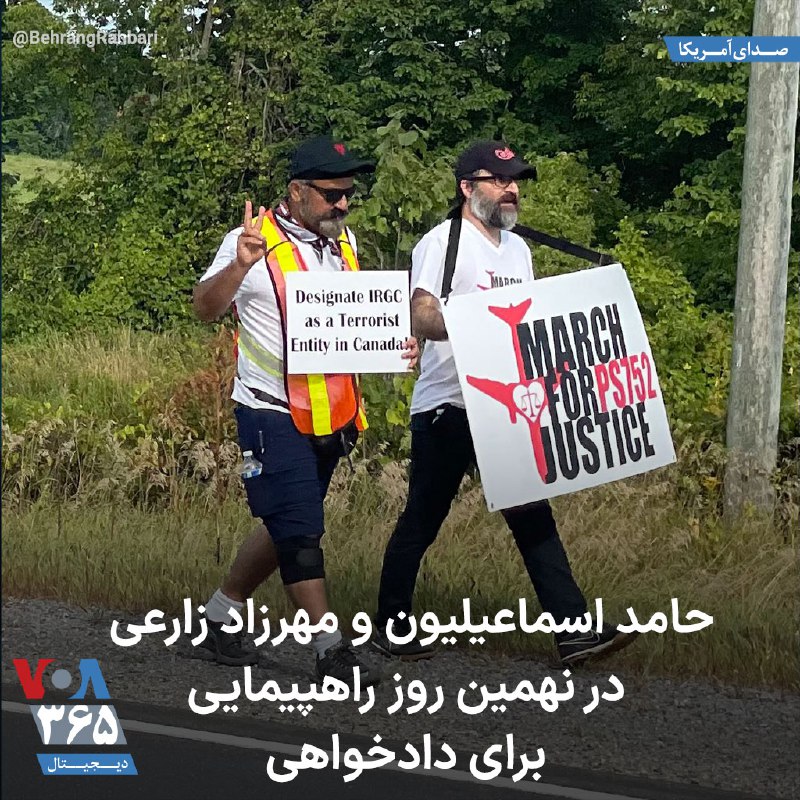 راهپیمایی #حامد_اسماعیلیون و #مهرزاد_زارعی به همراه تعدادی از خانوادههای جانباختگان پیاس ۷۵۲ در نهمین روز راهپیمایی برای #دادخواهی. راهپیمایی در اعتراض به خودداری دولت #کانادا از قرار دادن سپاه پاسداران در لیست گروههای تروریستی برگزار و مقصد نهایی اتاوا پایتخت کانادا خواهد بود