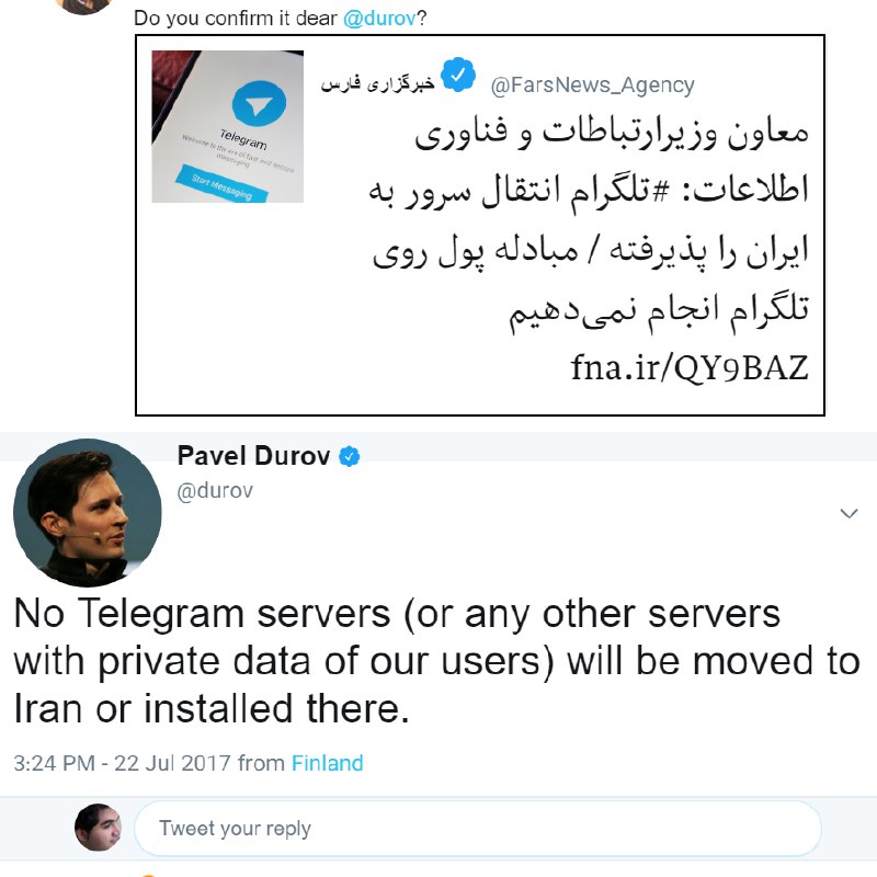 مدیر #تلگرام: هیچ یک از سرورهای تلگرام (یا هر #سرور دیگری با اطلاعات خصوصی کاربران ما) به #ایران منتقل یا در آنجا نصب نخواهد شد.