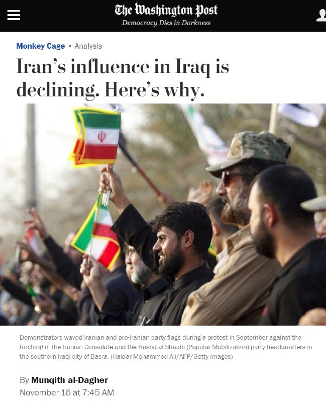 گزارش واشنگتن پسته.همان جریان رسانه ای که وقتی یکیشون یه چیزی به نفعتون میگه مثل قضیه عربستان روزنامه سپاه بل میگیره و همون رو عینن دستمایه می کنه..حالا واشنگتن پست داره تصویری می ده ترسناک از ریزش محبوبیت رژیم در عراق. به رغم ده ها میلیون دلار پول خرج شده.#دیگه_تمومه_ماجرا
