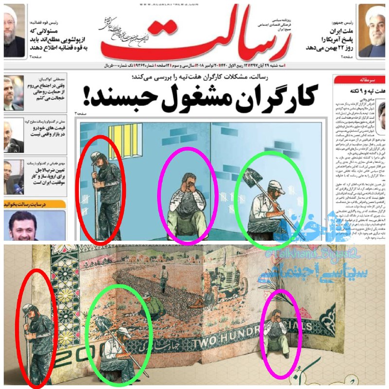 البته این سه کارگر که رسالت روی صفحه اول آورده، آن کارگران پشت اسکناس بیست تومانی نیستند. این سه قبلا در پوستری که دفتر رهبر جمهوری اسلامی درست کرده، به این شکل در آمده بودند.