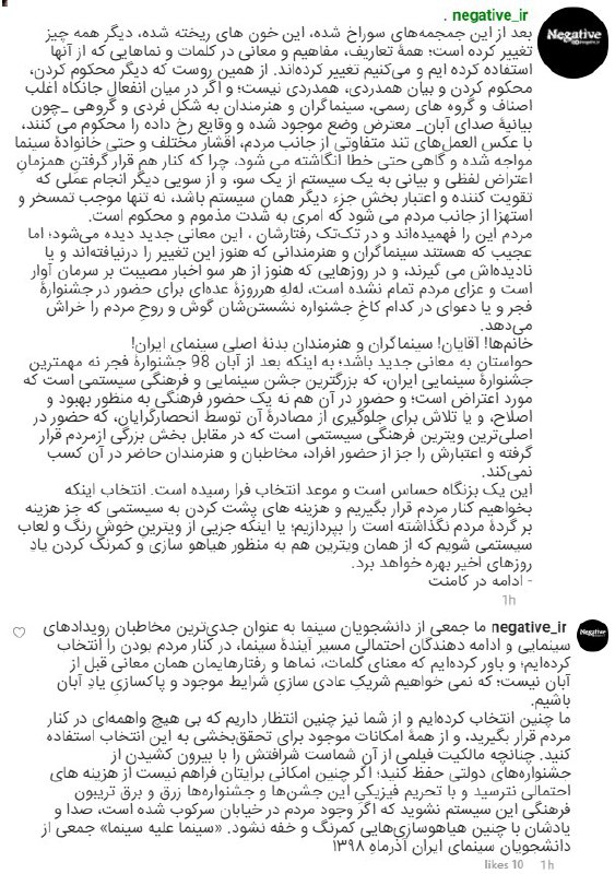 "بیانیه"ای که با امضای "جمعی از دانشجویان سینمای ایران" و با هشتگ #سینما_علیه_سینما در اینستاگرام منتشر شده: instagram