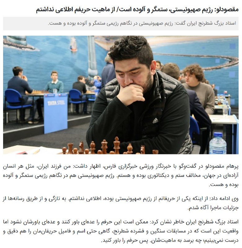 با توجه به حضور نمایندگان اسراییلی، ممکن است نمایندگان ایران در این بخش نیز با آنها مواجه شوند. فدراسیون شطرنج ایران از درج خبر پیروزی امین و پرهام در برابر حریف اسراییلی خودداری کرده است."