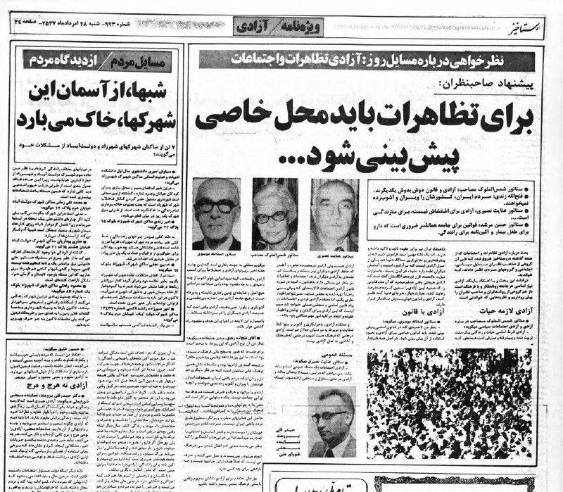 پیشنهاد ’اختصاص مکانی برای اعتراض’ از عیسی فرهادی فرماندار تهران که در شرق۲۳آذر۹۶ هم خبرش منتشر شد،مشابه همان پیشنهادیه که ۲۸مرداد۵۷ در روزنامه رستاخیز چاپ شدهبود