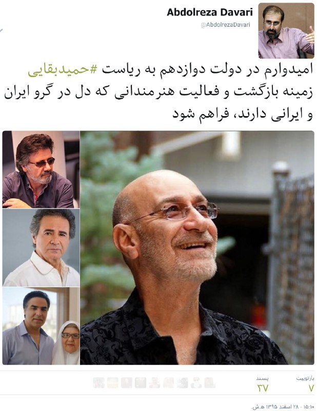'#عبدالرضا داوری نوشته امیدوارم در دولت #بقایی، داریوش، قمیشی، معین و امید به ایران برگردن، کاش ابی، گوگوش، شماعی زاده و شب پره رو هم بیاره'