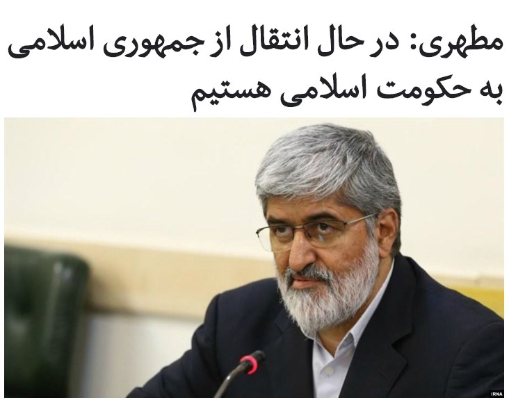 علی مطهری، نماینده مجلس ایران با تاکید بر اینکه «در حال انتقال از جمهوری اسلامی به حکومت اسلامی هستیم»، گفته است: «عدهای در درون حاکمیت به طور جدی به دنبال #حکومت_اسلامی هستند، چرا که رأی مردم را تزئینی میدانند».