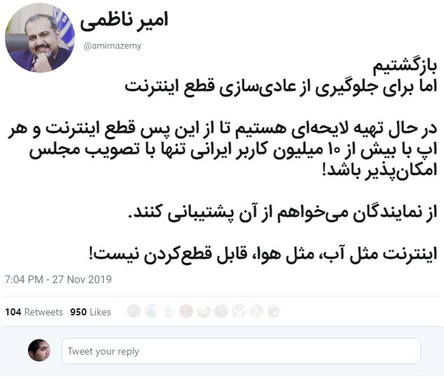 جهت اطلاع آقای ناظمی و دوستانشان: قطع کردن اینترنت نقضِ اصل نهم قانون اساسیست و اساسا هیچ مقامی حق محدود یا مسدود کردن آنرا ندارد.