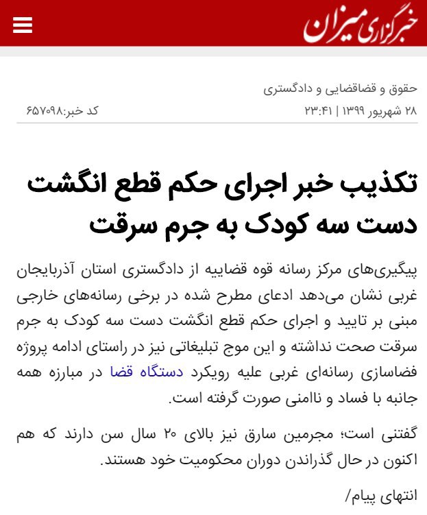 اواخر شهریور ماه امسال تایید حکم #قطع_دست چهار زندانی متهم به سرقت در #ارومیه از سوی دیوان عالی کشور با واکنش بسیاری از سوی مدافعان حقوق بشر و کاربران شبکههای اجتماعی مواجه شد. 🔗 #قطع_عضو