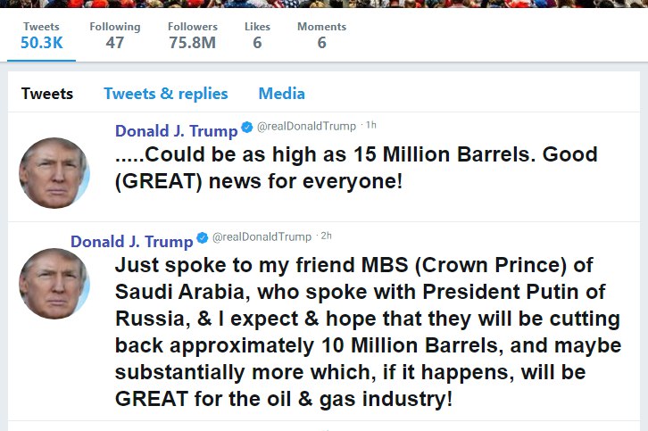 #ترامپ نوشته «با دوستم محمد بن سلمان شاهزاده عربستان حرف زدم، او هم با پوتین حرف زد، انتظار دارم که آنها [توافق کنند] ۱۰ میلیون بشکه نفت در روز از تولیدشون بکاهند، که برای صنعت نفت و گاز آمریکا خوب خواهد بود.»
