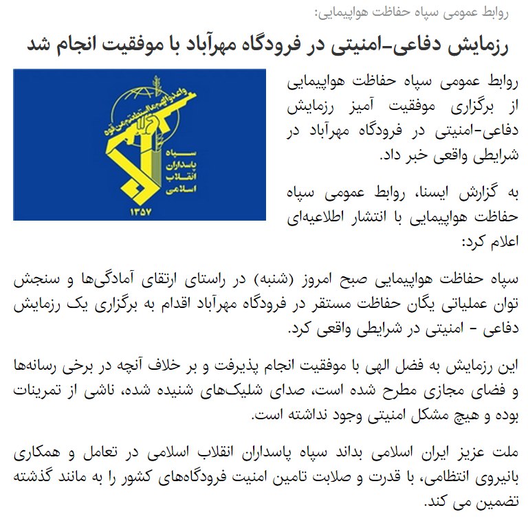 بر اساس اعلام منابع رسمی ، اتفاقات مربوط به فرودگاه امام ، مانور آمادگی نیروهای مسلح عنوان شده است ...