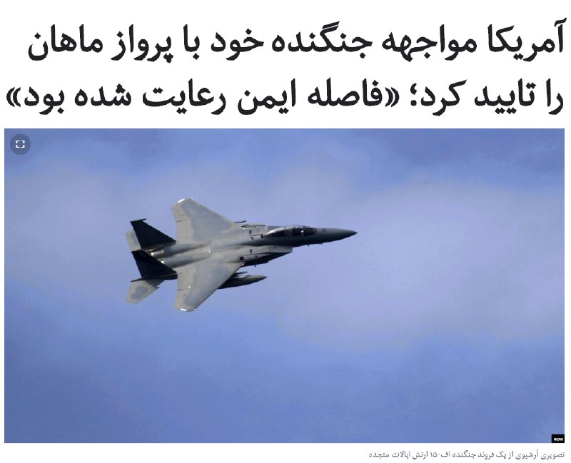 ارتش آمریکا در مورد گزارش رسانه های ایران از مانور جنگنده های آمریکایی در اطراف یک پرواز خطوط ماهان در آسمان سوریه گفته است که هدف بررسی بصری این هواپیما برای اطمینان از امنیت نیروهایش بوده است.