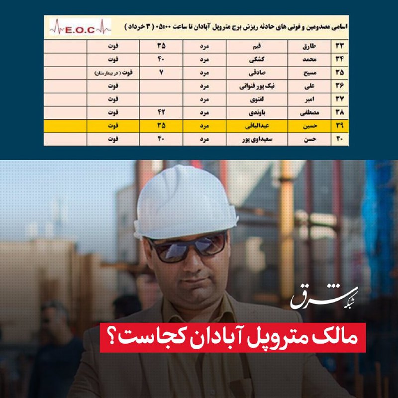 نام #حسین_عبدالباقی مالک ساختمان متروپل آبادان در بین فوتشدگان ساختمان متروپل دیده میشود، این در حالیاست که منابع محلی مدعیاند او متواری شده