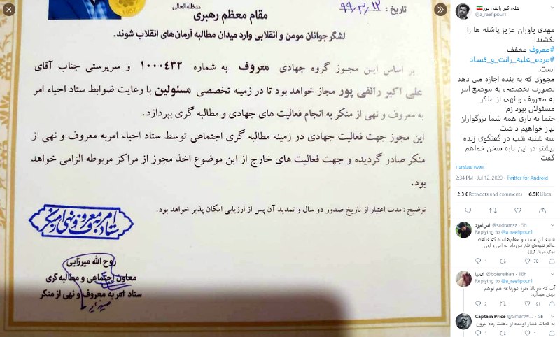 #مجوز رسمی دادهاند که #رائفیپور میتواند مسولان را امر به معروف کند... جواز داری؟ بله. جواز چی؟ جواز امر به معروف مسئولان.!