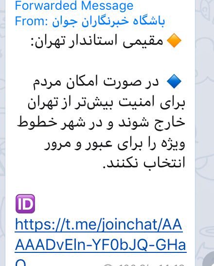 کانال تلگرامی باشگاه خبرنگاران به نقل از استاندار تهران گفته برای امنیت بیشتر از شهر خارج بشین، کمی بعد استاندار این رو تکذیب کرده و گفته خبرها رو از صداوسیما و خبرگزاریهای معتبر دنبال کنین!