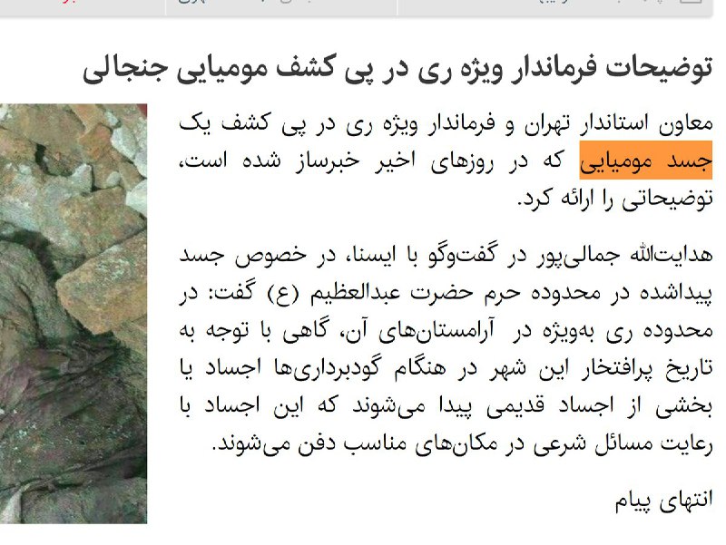 یعنی مقامات لزوما منکر #رضاشاه بودنش نیستند ولی بدون ثبت یک نظر رسمی درباره هویت جسد پیدا شده میخوان کشف یک #مومیایی در اون نقطه خاص رو با گفتن «پیدا شدن اجساد قدیمی در شهر ری» اتفاقی معمول جلوه بدن و در نهایت حتی در همین حد هم صریح نگن که با همین جسد پیدا شده دقیقا چه کردند. فقط از جملاتی کلی مخاطب اینطور برداشت کنه که لابد این رو هم یک جایی دفنش کردند بدون اینکه خودشون دقیقا همچین چیزی رو گفته باشند.